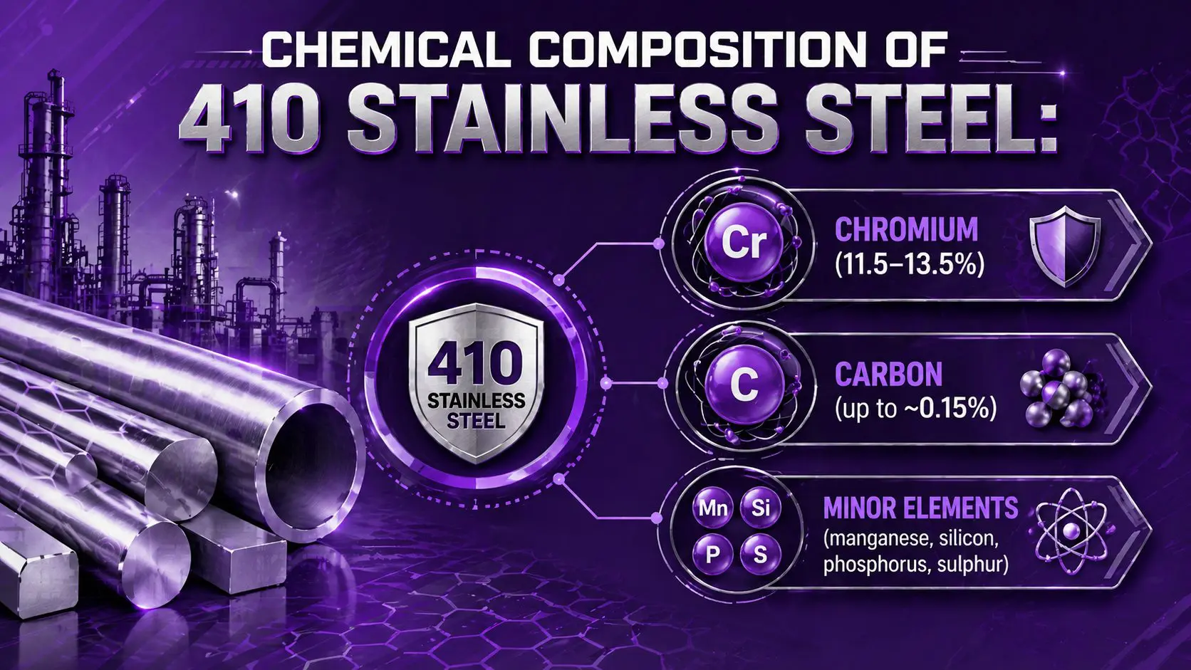 Carbon plays a key role in strength. It allows 410 to be heat-treated and hardened. This is what makes it suitable for wear-resistant and load-bearing applications.