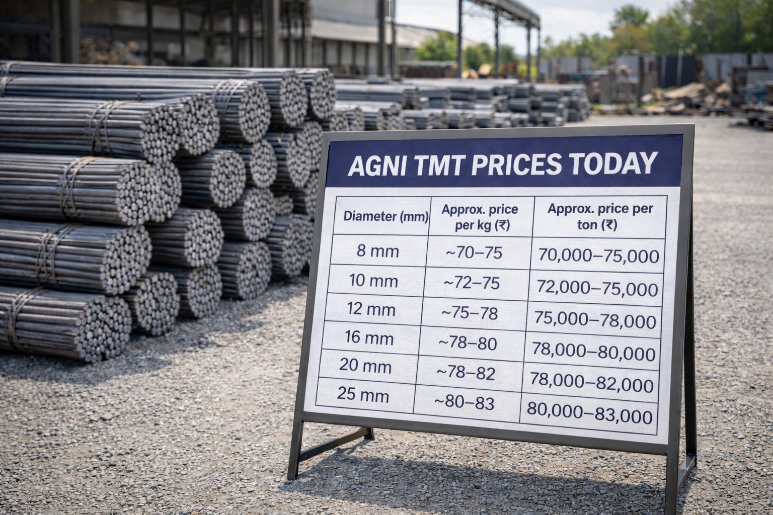 Below is a sample of Agni TMT bar rate today for common diameters. These are market-indicative landed rates (excluding very remote logistics surcharges).