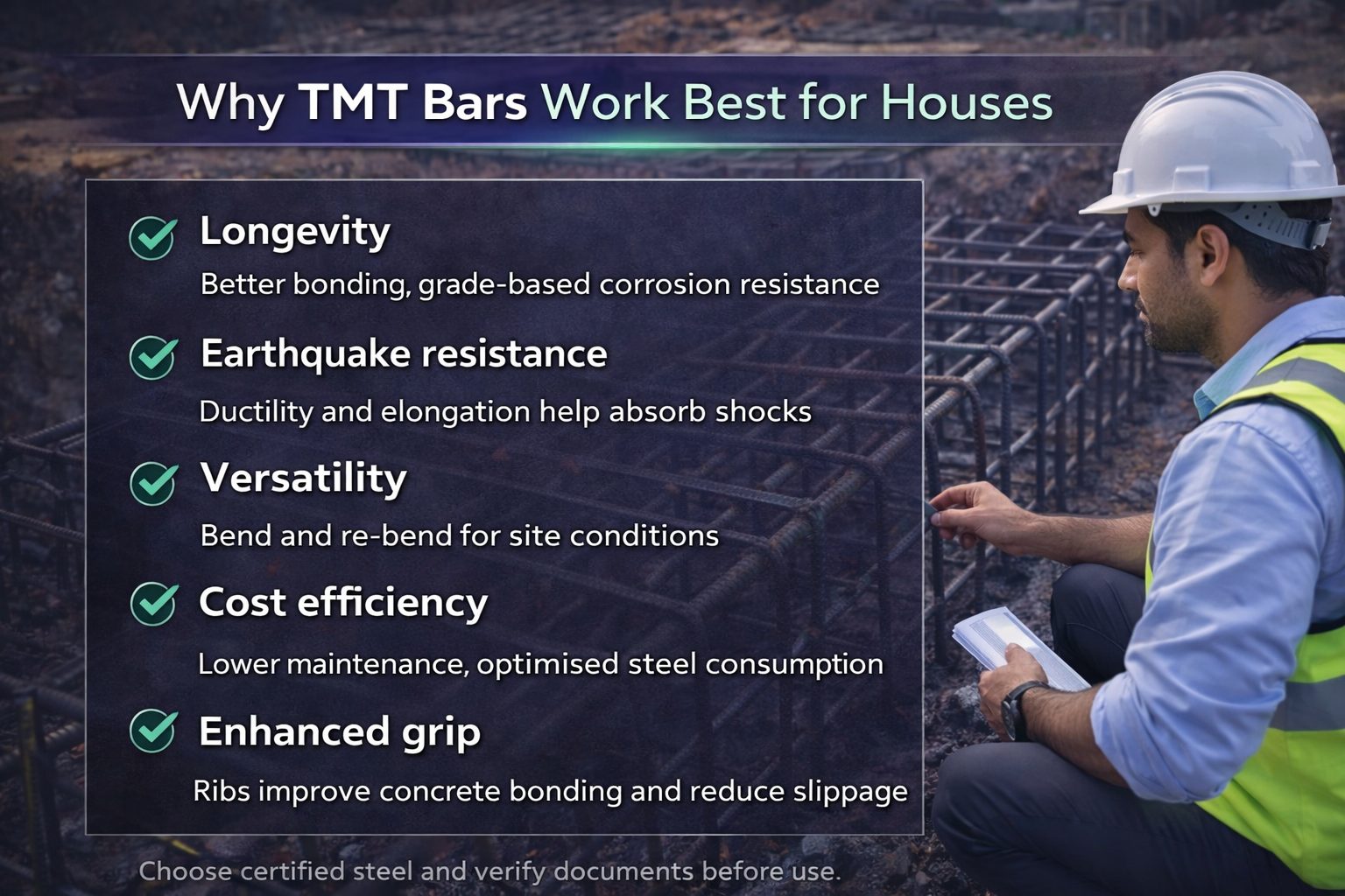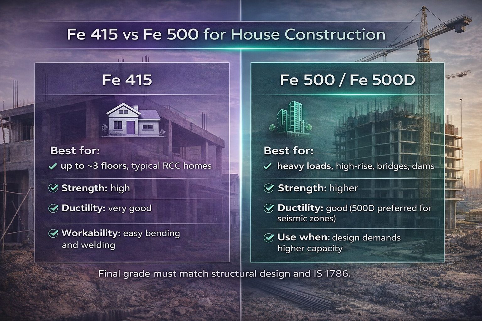 When it comes to house construction, TMT bars of grade Fe 415 and Fe 500 are regarded as the most suitable. They are corrosion resistant, have have thermal stability, high elongation and ductility, making them suitable for RCC projects and for construction in areas prone to seismic activities or with exposure to atmospheric moisture.