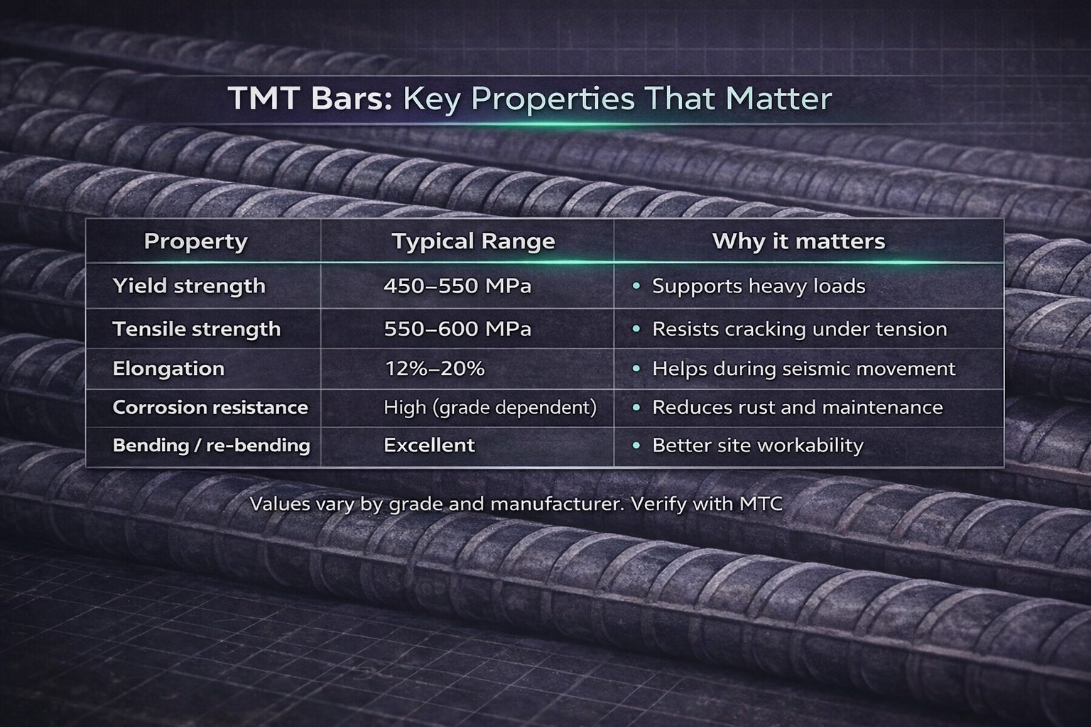 TMT bars are known for their robust and distinct mechanical and physical properties which makes them among the top 10 best steel for house construction projects. Here’s an overview:
