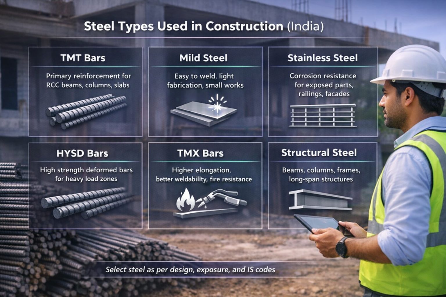 - HYSD steel: High Yield Strength Deformed bars are robust and preferred in projects requiring heavy load bearing