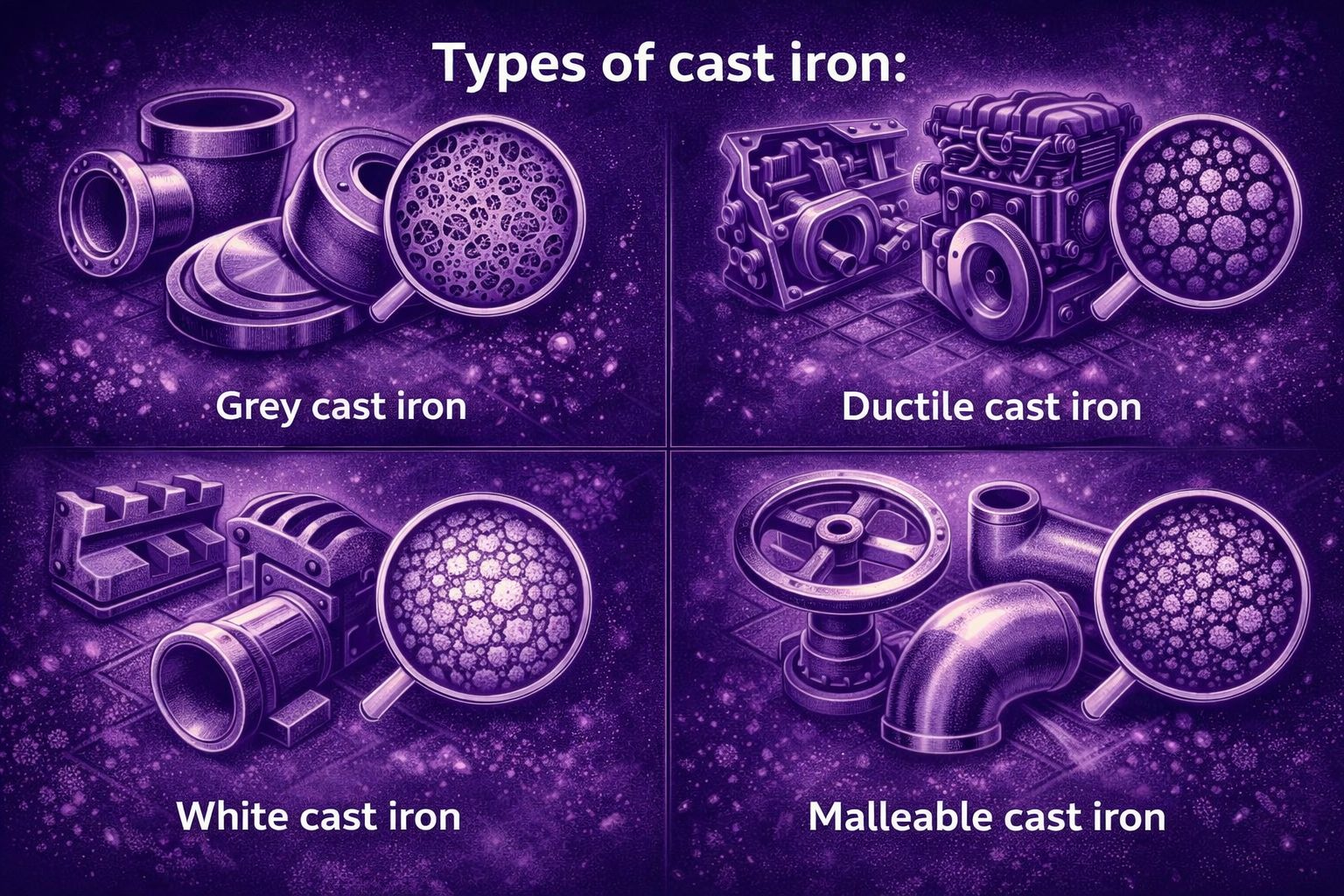 Grey cast iron is the most commonly used type. It contains graphite flakes, which give it good machinability and vibration damping.