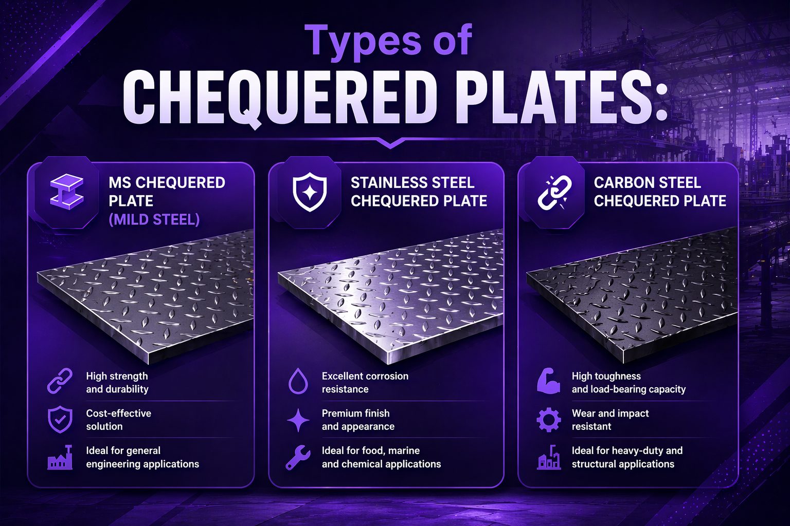 The three main types of chequered plates are MS, stainless steel, and carbon steel plates. Each type offers different benefits in terms of cost, durability, and application, making it important to choose based on project needs.