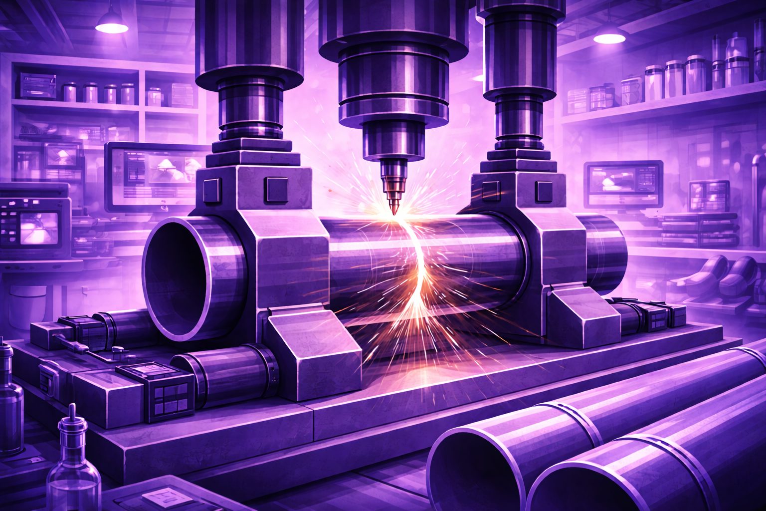 In welded steel pipe manufacturing, a flat steel coil is formed into a cylindrical shape. Electric current heats the edges of the steel strip, and pressure joins them together to create a longitudinal weld seam.