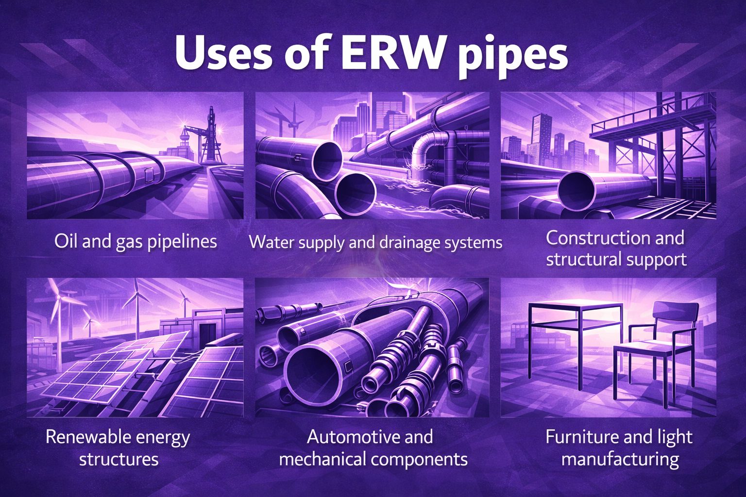 ERW pipes are used across multiple industries due to their strength, consistent quality, and cost efficiency. These pipes are suitable for transporting fluids, supporting structures, and manufacturing industrial components. As a result, ERW pipe applications continue to expand in infrastructure, energy, and manufacturing sectors.