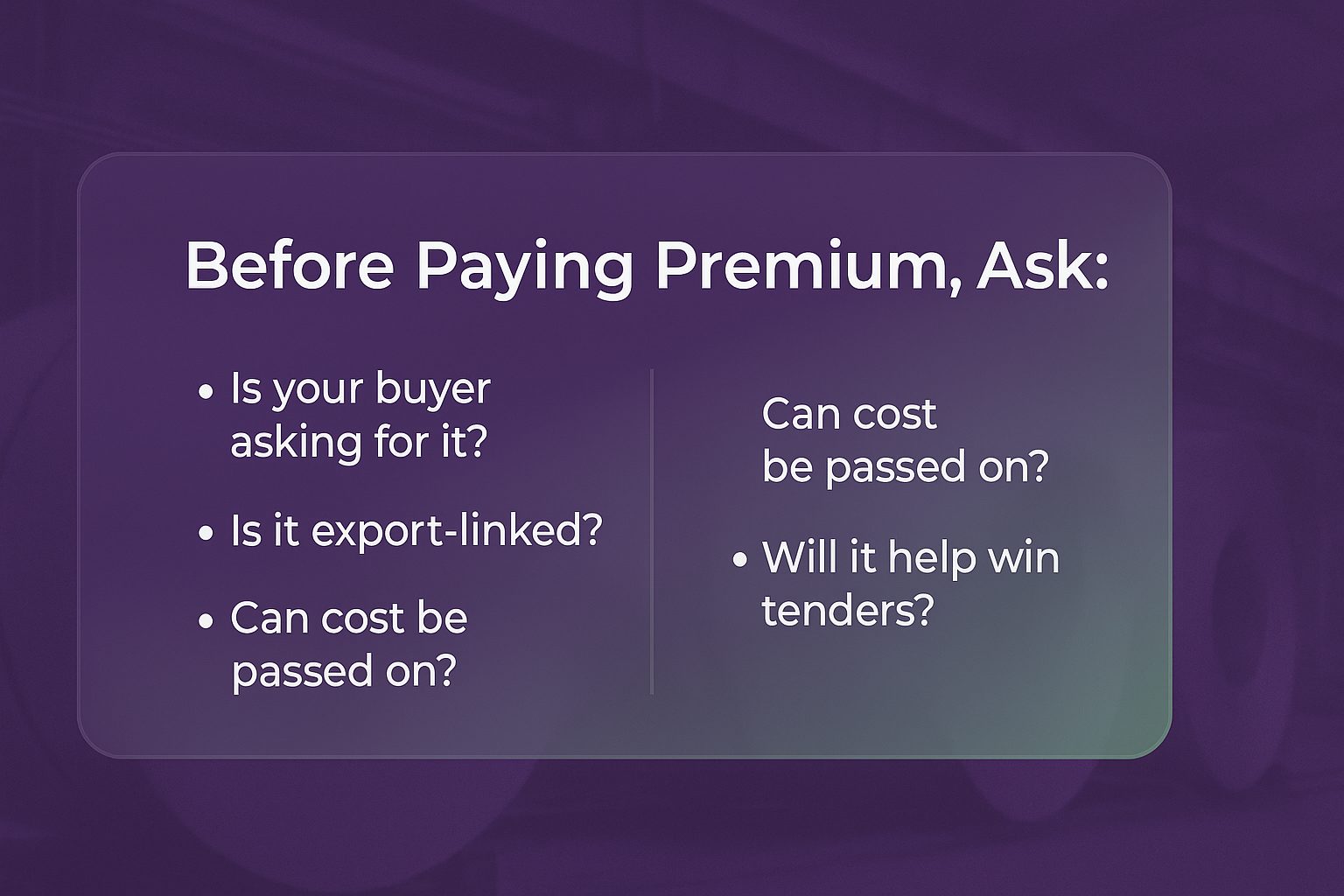 Paying 15–40% extra for green steel is a major decision for any MSME. For some businesses, it is necessary for staying eligible for orders. For others, the premium does not create any direct benefit. Before committing, it helps to step back and check a few basics.