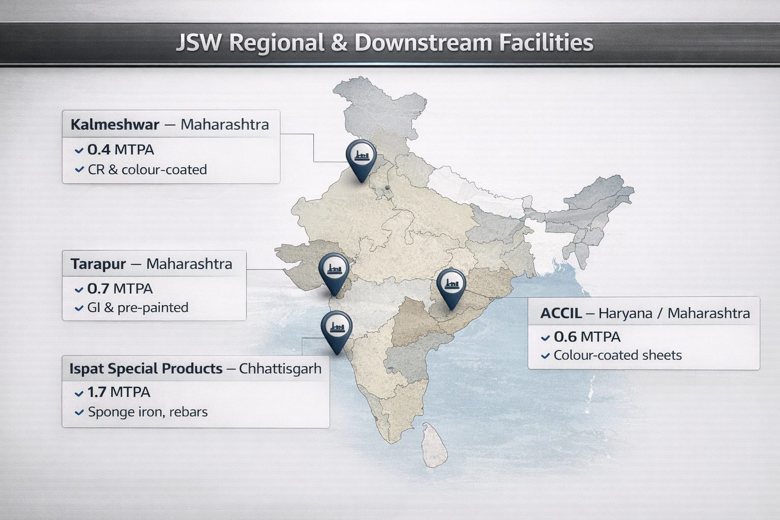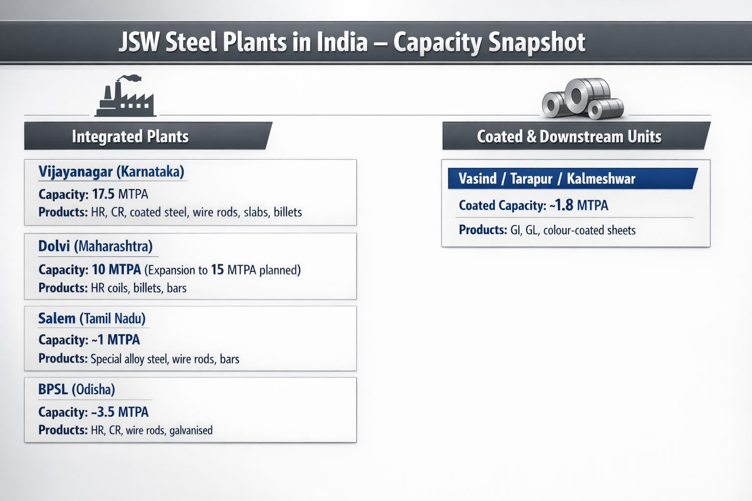 | Vasind / Tarapur / Kalmeshwar (Coated / downstream units) | Maharashtra | Coated steel / sheet capacity ~1.8 MTPA (JSW Coated Products) | GI / GL / colour coated / export steel sheets | These units are downstream/finishing – not full integrated steelmaking plants |