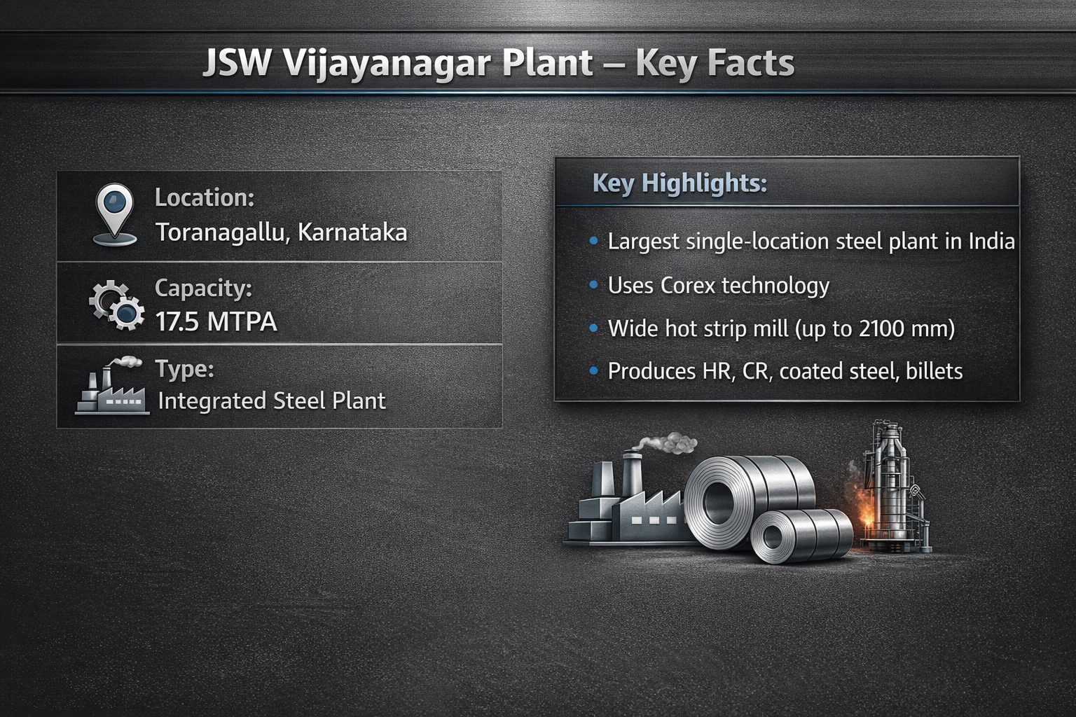 | Vijayanagar (Toranagallu, Karnataka) | Karnataka | 17.5 MTPA (including ~5 MTPA under commissioning) | HR, CR, coated steel, wire rods, slabs, billets | Largest single-location plant in India; strategic JV with JFE Steel for special/GO electrical steel projects |