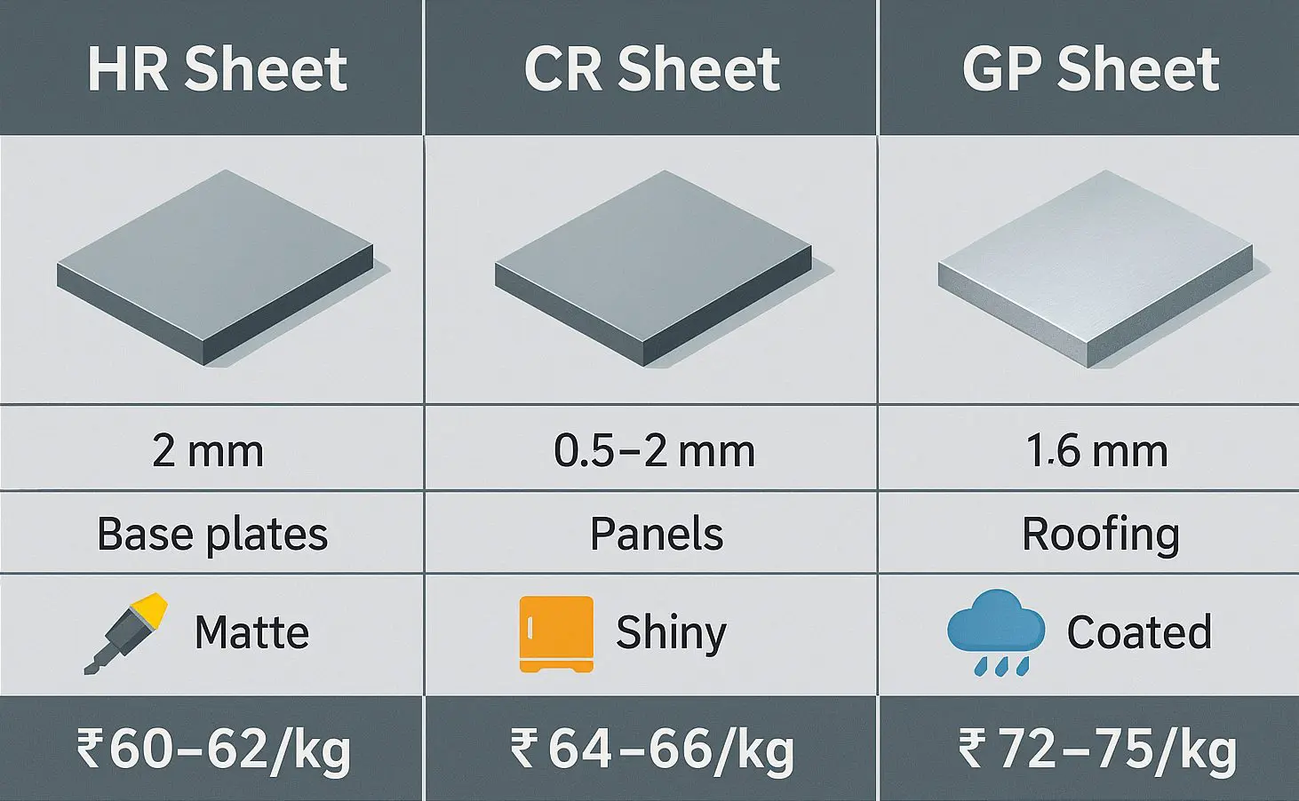 Rates also vary depending on thickness, type of sheet (HR, CR, GP), and the city. A 2mm HR sheet in Mumbai might be ₹63/kg, but the same sheet in Delhi could be ₹61 or less. Add galvanised coating or cut size, and the rate shifts again.