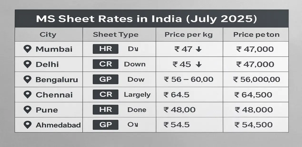 The table below shows the current MS sheet rates in different cities. These are market prices – they change often, sometimes week to week. Prices are listed both per kilogram and per metric tonne, based on what’s commonly traded. This is meant for buyers who want a clear idea of where the market stands right now – not estimates, just the actual numbers going around.