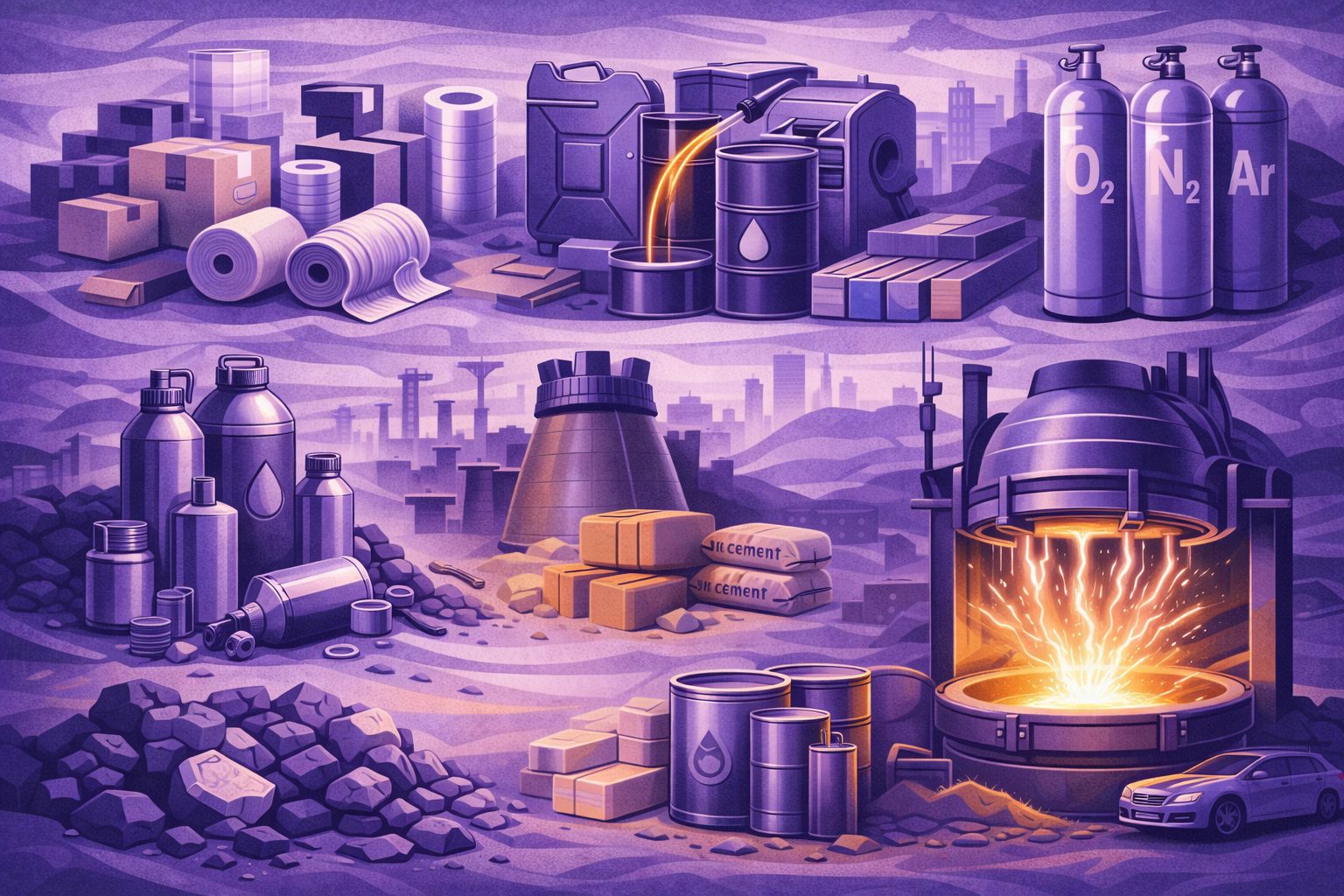 | Steel plant example | Iron ore, coking coal, scrap, and ferroalloys used to produce steel. | Electrodes, refractories, furnace fuel, and maintenance consumables. |
