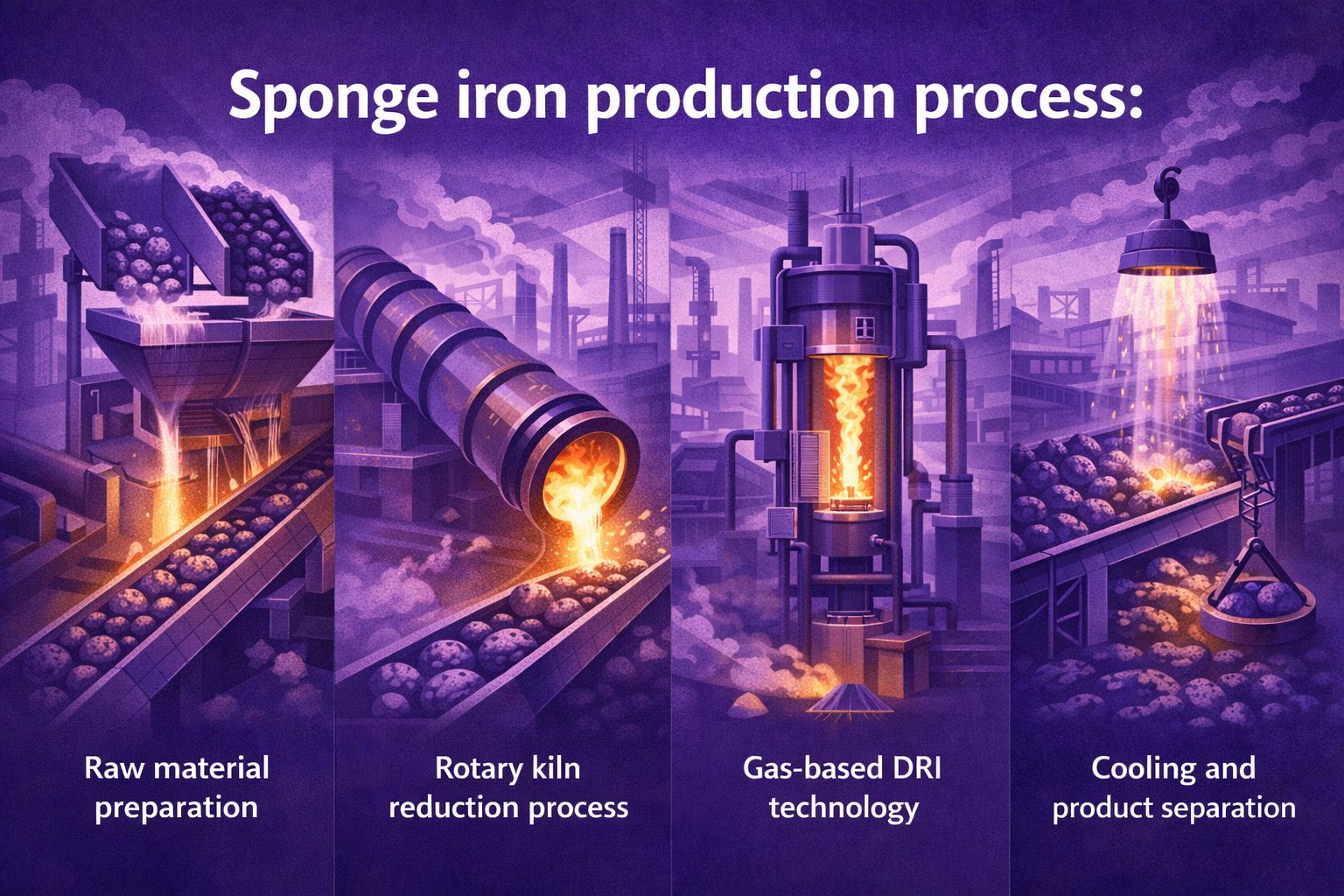 | Sponge iron (DRI) | Solid reduced iron with low impurities | Widely used in EAF and induction furnaces |