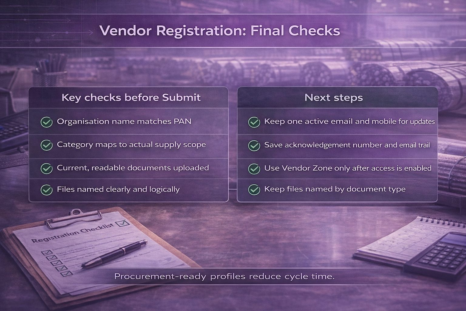 In real procurement cycles, timing matters more than cost. A complete, well-aligned registration reduces avoidable follow-ups and speeds up the first level of review. It also creates a single vendor profile that procurement teams can validate when requirements arise.