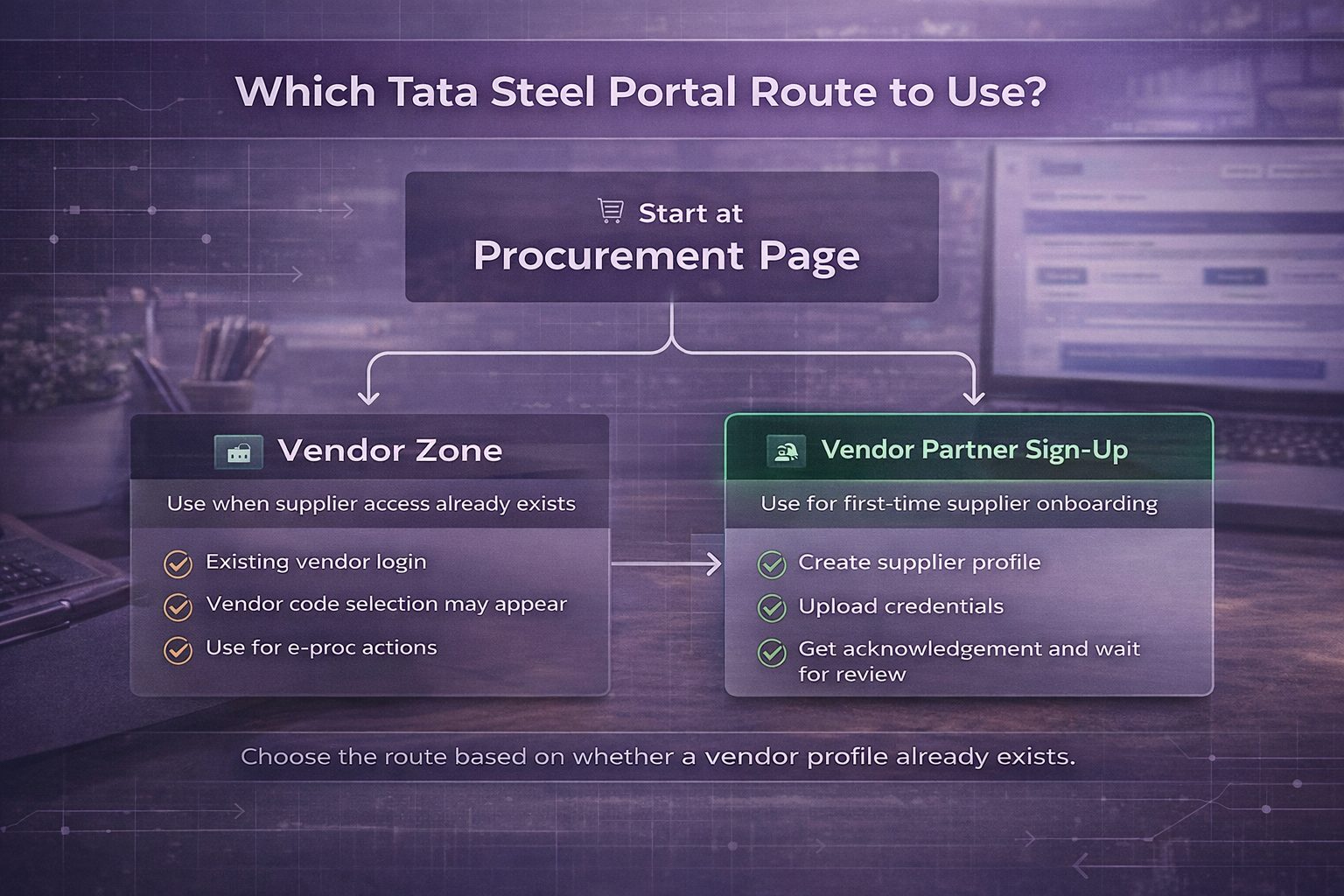 - The correct portal route on the Tata Steel procurement portal and when Tata Steel eProc login applies