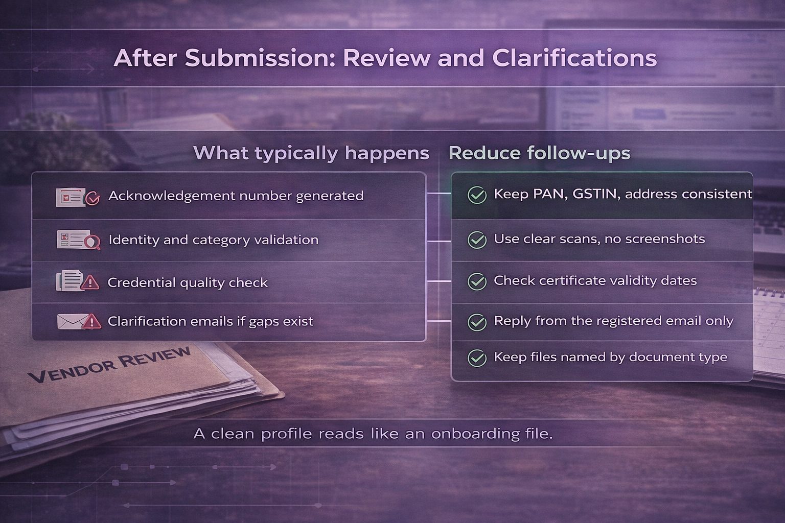 After the form is submitted, the portal generates an acknowledgement or request number. The application then goes through review. Procurement teams may validate identity details, category mapping, and credential uploads. Clarification emails are common when the organisation name does not match PAN records, files are unreadable, or the selected category does not reflect the actual supply scope.