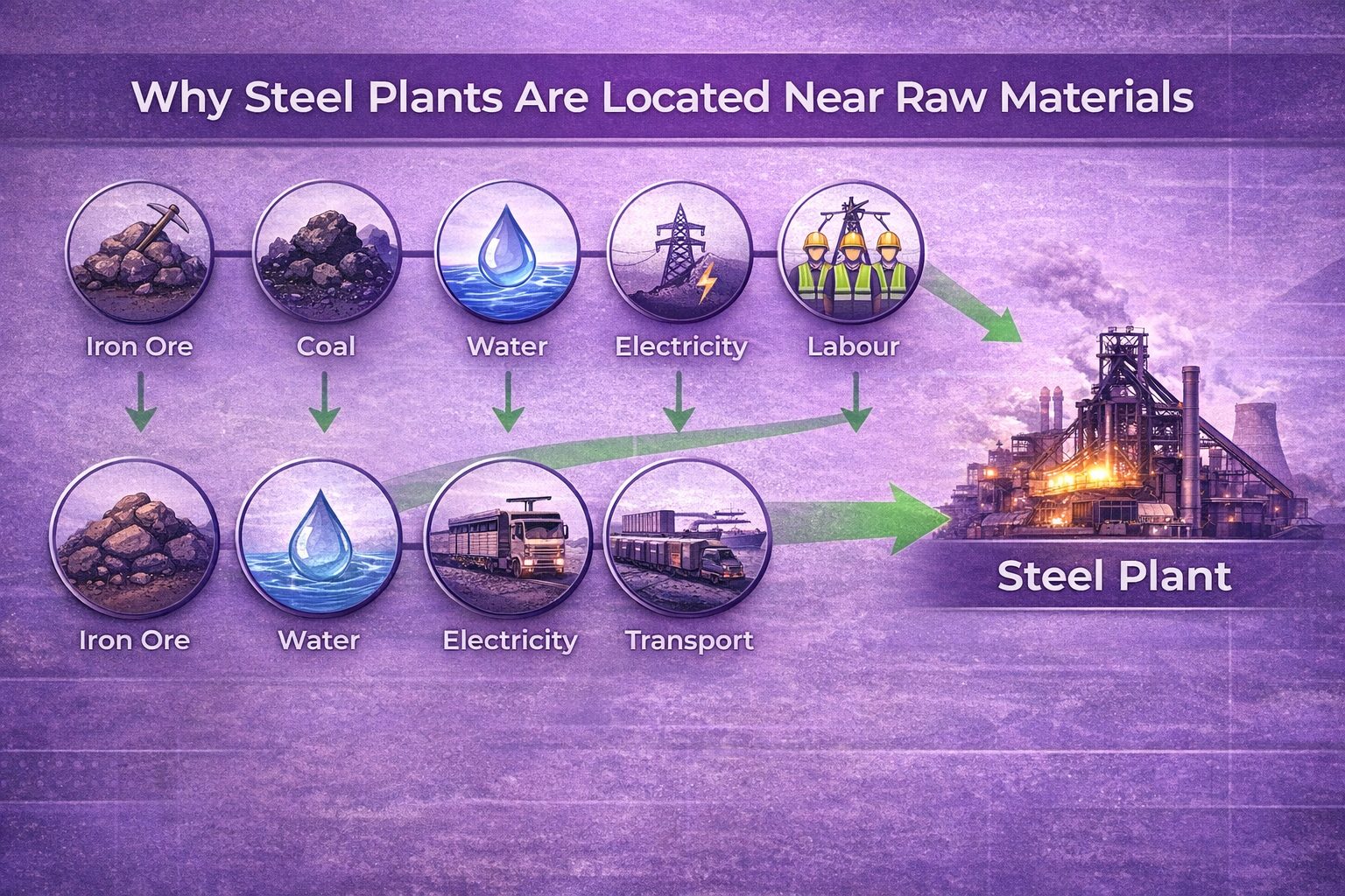 The primary raw materials used for steel manufacturing is iron ore and coking coal. For making steel alloys, carbon and other metal components are used. The location of the steel plant therefore is determined by its access to raw materials (and other resources such as water, clean electricity/power, and labour).