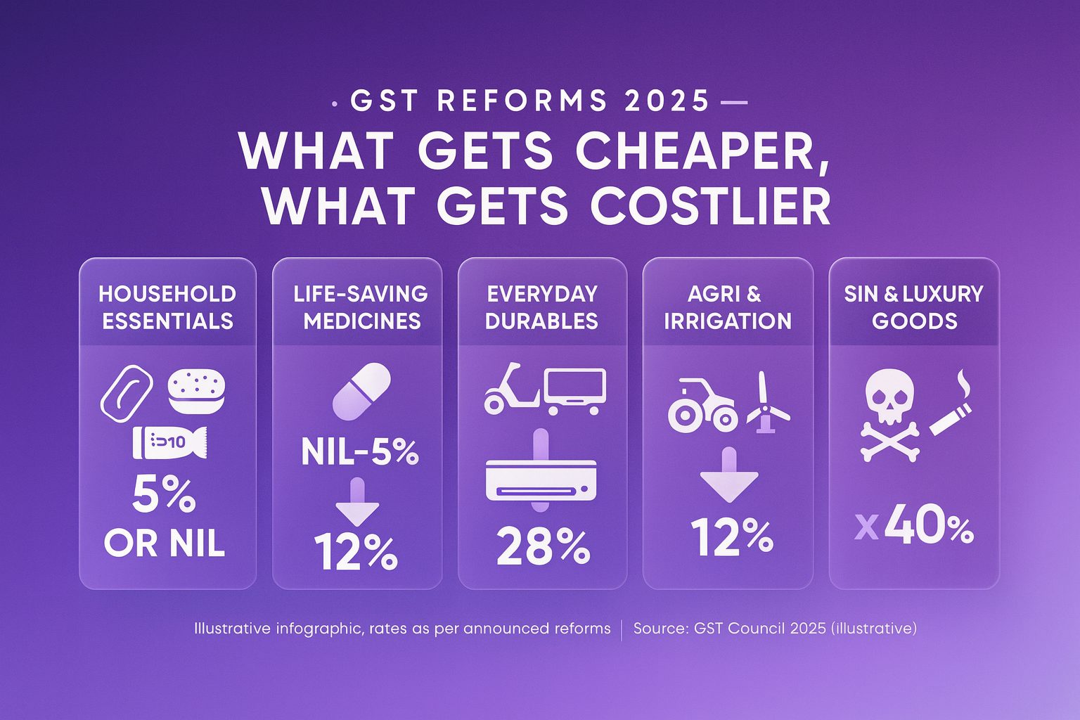 - GST reforms cut taxes on household essentials (soaps, toothpaste, Indian breads) to 5% or Nil
