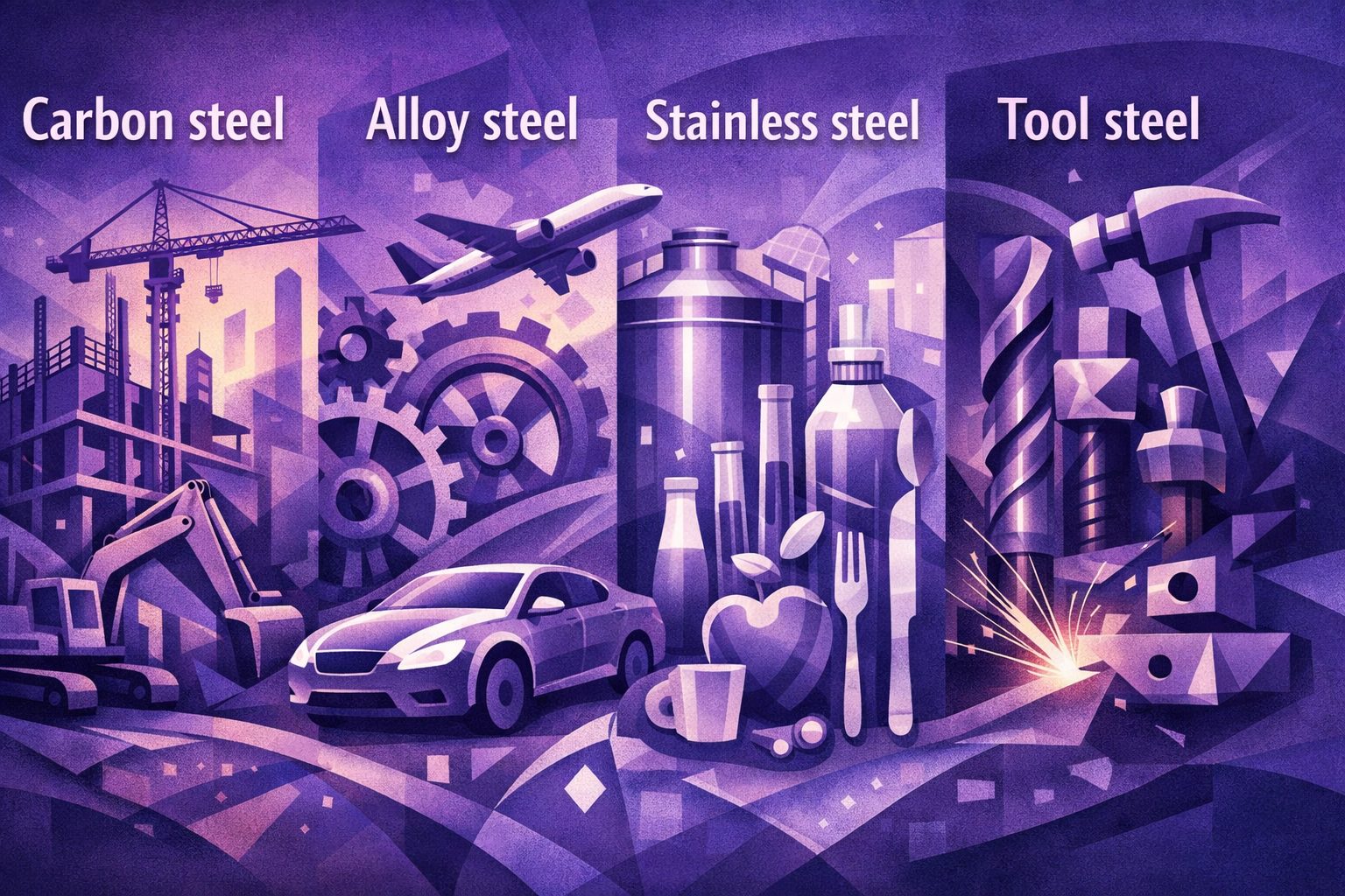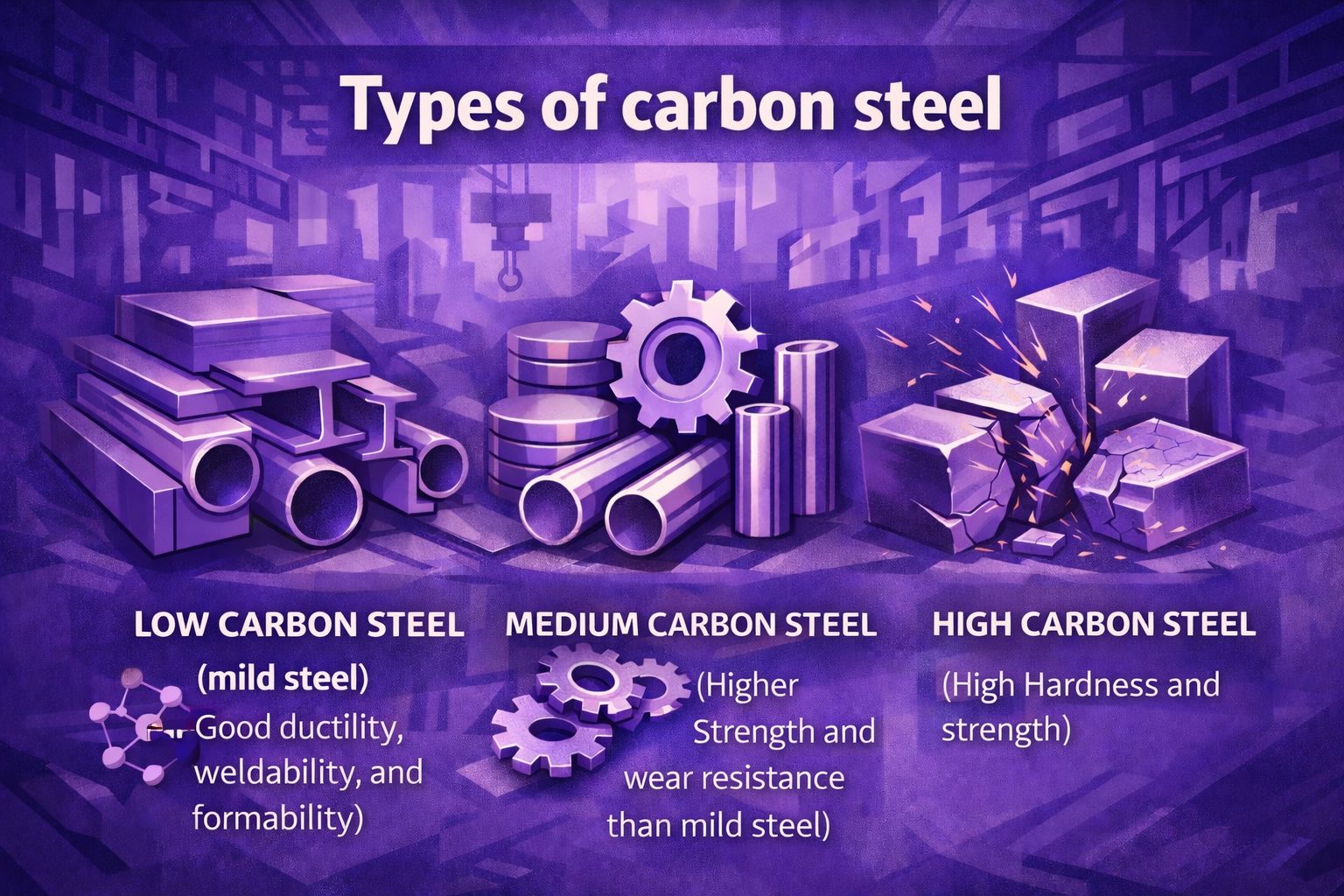 Carbon steel: Made primarily from iron and carbon. Known for strength, affordability, and versatility. Widely used in construction, structural components, pipes, and machinery.