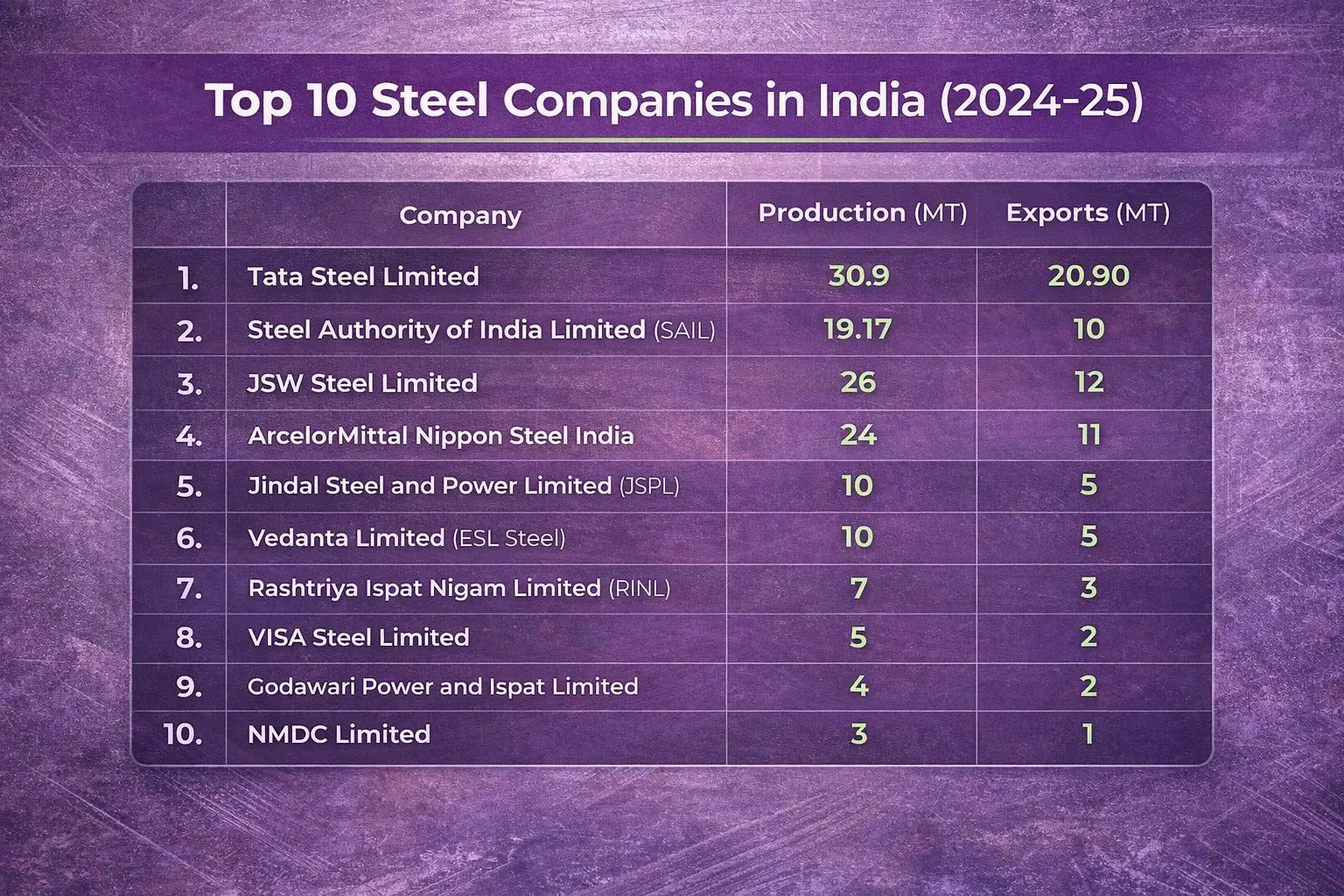 Here is the list of the top steel companies in India (2025-2026). However the data is based on their production and export statistics in year of 2024-2025.