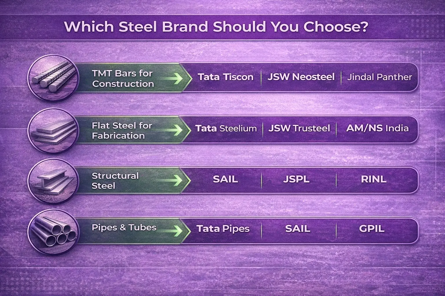 | TMT bars for construction (homes, buildings, RCC work) | Tata Tiscon, JSW Neosteel, Jindal Panther |